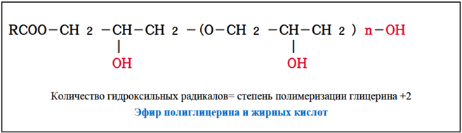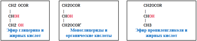 Эфиры глицерина – также один из широкоиспользуемых в Японии пищевых эмульгаторов. Эфиры глицерина, или глицериды – это гидрофобные эмульгаторы, которые используют для предотвращения отделения частиц воды в эмульсиях В/М, например, маргарин. Также, при взаимодействии с другими гидрофильными эмульгаторами, эфиры глицерина стабилизируют эмульсию М/В. Кроме этого, эфиры глицерина широко используются в производстве хлебобулочных изделий для замедления процесса черствения хлеба. Сорбитаны – сложные эфиры ангидросорбита и жирных кислот, не растворимы в воде. Обычно используются вместе с другими эмульгаторами. Спектр использования сорбитанов очень широкий: от стабилизации молочных продуктов и мороженого до жевательной резинки. Эфиры пропиленгликоля используются вместе с другими эмульгаторами, улучшая пенообразование в мороженом, десертах и т.д., а также обеспечивая стабилильность эффекта других эмульгаторов. Растворяются в тёплых спиртах, гликолях, других органических растворителях; плохо растворяются в воде. Эфиры полиглицерина: добавки этих групп представляют собой сложные эфиры жирных кислот с полиглицерином. Используются для стабилизации эмульсий В/И и М/В, контроля кристаллизации жиров, дисперсии порошков. Полисорбаты (PS) - оксиэтилированные сорбитаны, которые обладают прекрасными свойствами стабилизации, пенообразования, дисперсии, увлажнения. Во многих странах, начиная с США и стран ЕС, широко используются как стабилизаторы и солюбилизаторы в производстве шоколада, хлебобулочных изделий, салатных заправок и др. Пищевая добавка PS 40, использование которой разрешено в странах ЕС, в Японии не используется. Прочие виды: лактилаты кальция (CSL) и некоторые другие. Использование ограничено. 5. Структура эмульгаторовНиже приведены химические формулы основных видов эмульгаторов: